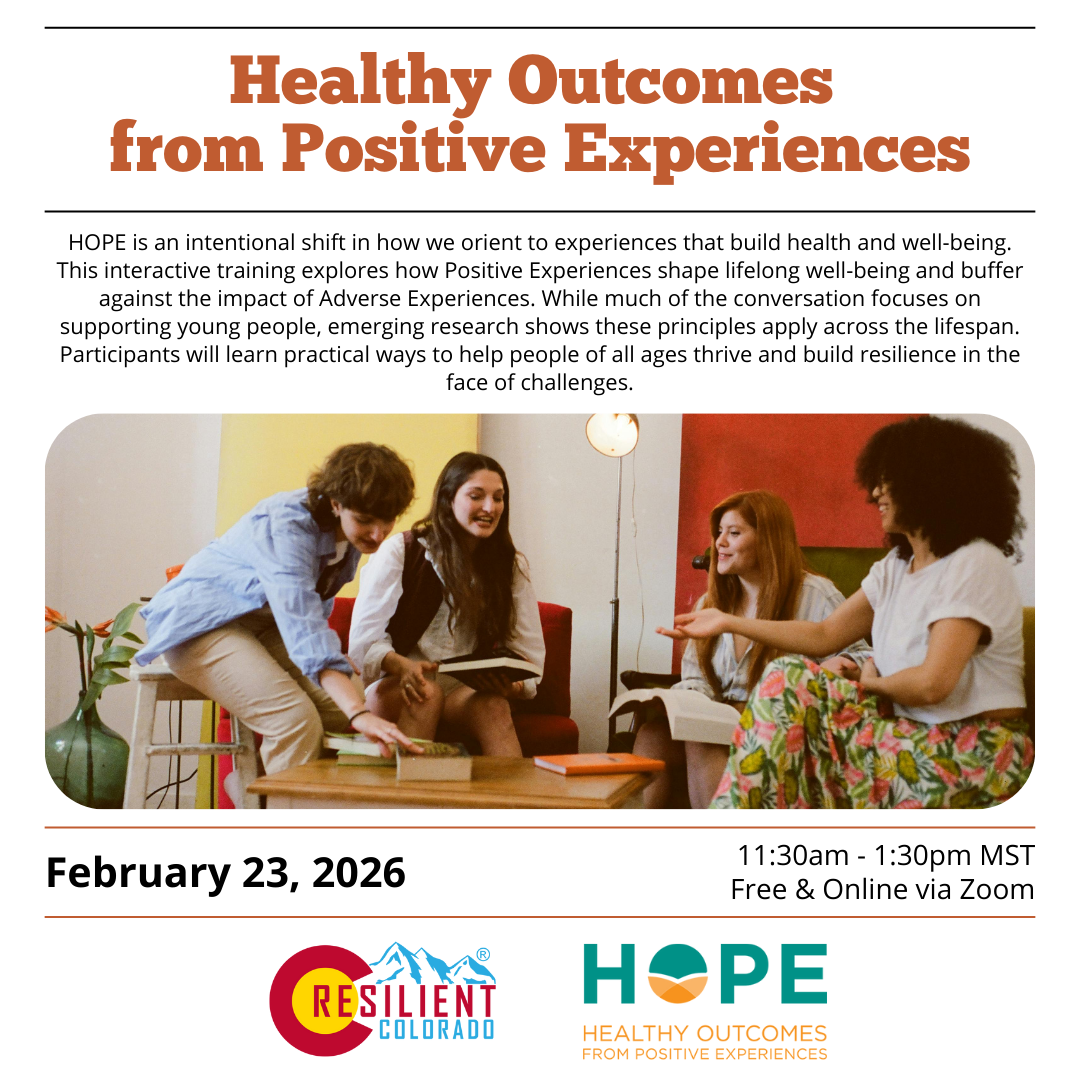 HOPE is an intentional shift in how we orient to experiences that build health and well-being. This interactive training explores how Positive Experiences shape lifelong well-being and buffer against the impact of Adverse Experiences. While much of the conversation focuses on supporting young people, emerging research shows these principles apply across the lifespan. Participants will learn practical ways to help people of all ages thrive and build resilience in the face of challenges.